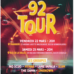 Le projet 92 Tour réunissant les groupes No Scud, Hymar, Lame Impala, Slam, The Damn et Unknow, issus des Conservatoires de Gennevilliers et de Chaville, se produira sur la scène du Tamanoir.